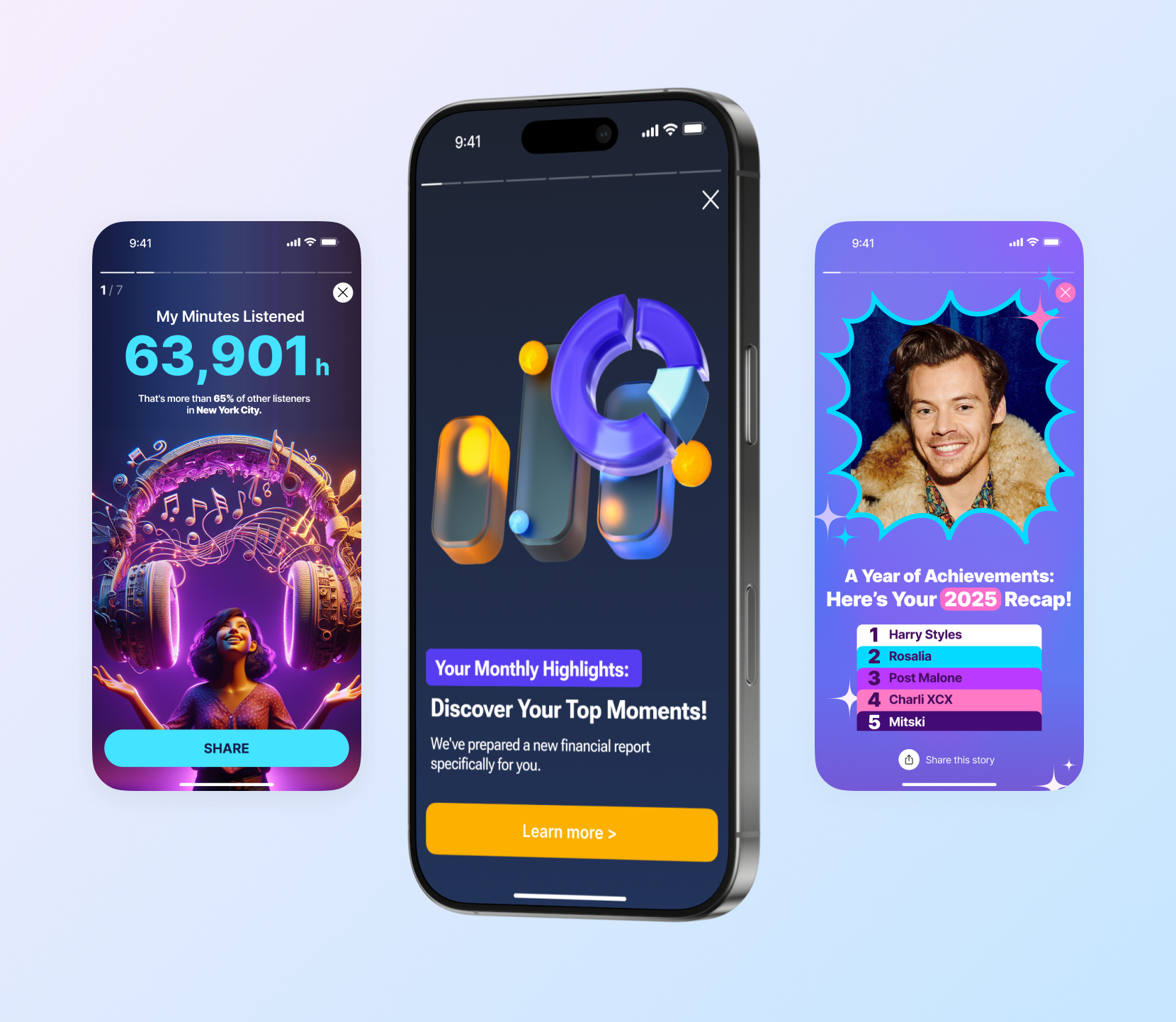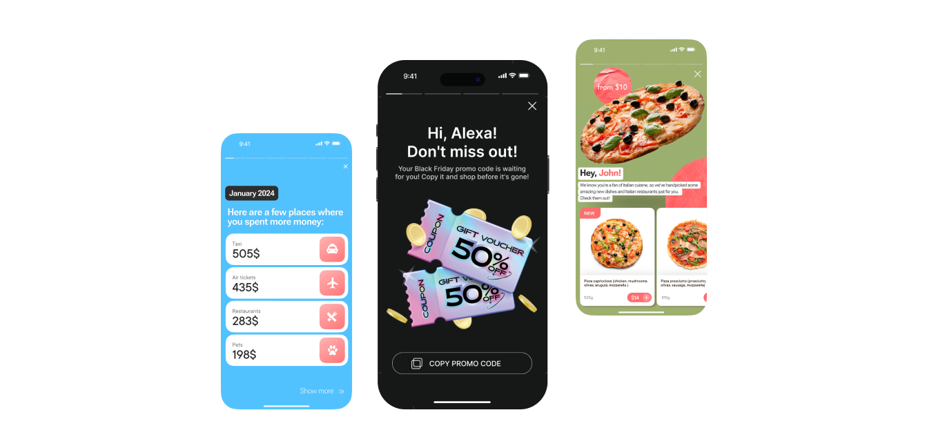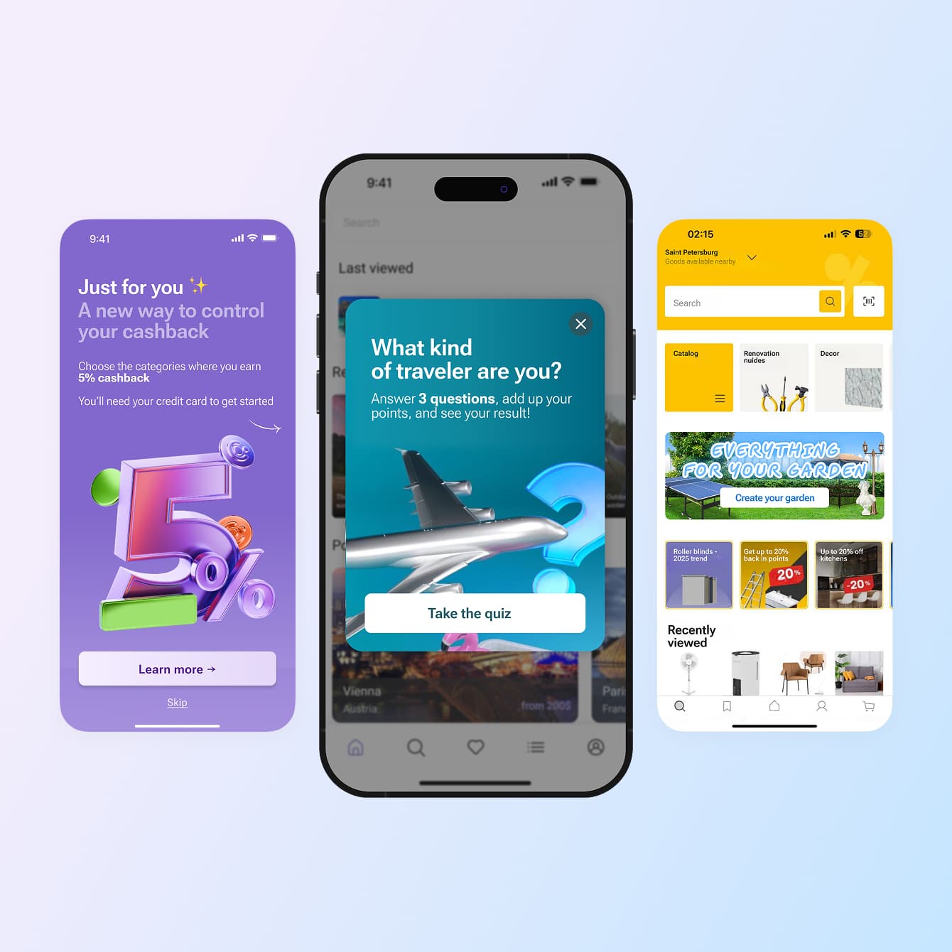 Choose which content appears on each screen, define its timing, and pair it with the format that fits user intent. Stories, banners, and in-app messages work together to move users from discovery to action
