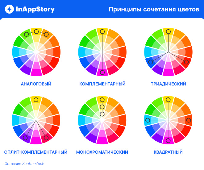Глаз человека способен различать более 30 000 оттенков цветов, но для одной истории хватит всего нескольких — двух-трех будет вполне достаточно. Так воспринимать историю будет проще, а большое разнообразие цветов, скорее всего, будет отталкивать. Для ориентира можно использовать базовые принципы сочетания цветов, как на картинке ниже.