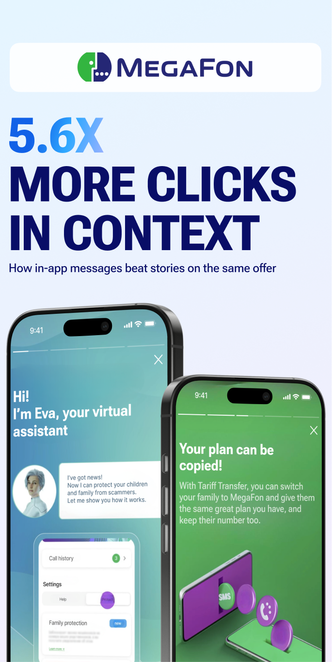 В кампании по смене тарифа картина была похожей. Сторис в среднем показали 1,01 % CTR, in-app сообщения — 2,84 %.